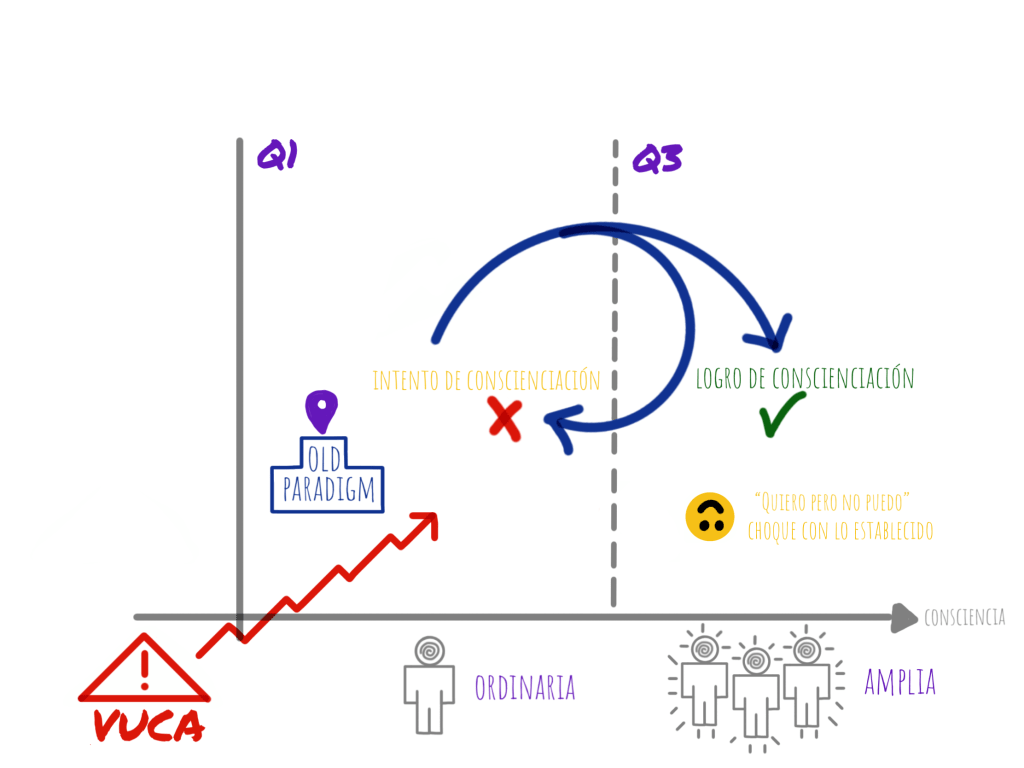 Algunas empresas intentan renovar su mindset, pero no acaban de lograrlo. La inercia hace lo suyo, las cosas quedan a medias (Q1 ⇿ Q3): oscilando entre una conciencia ordinaria (Q1) y algún rasgo de conciencia amplia (Q3).