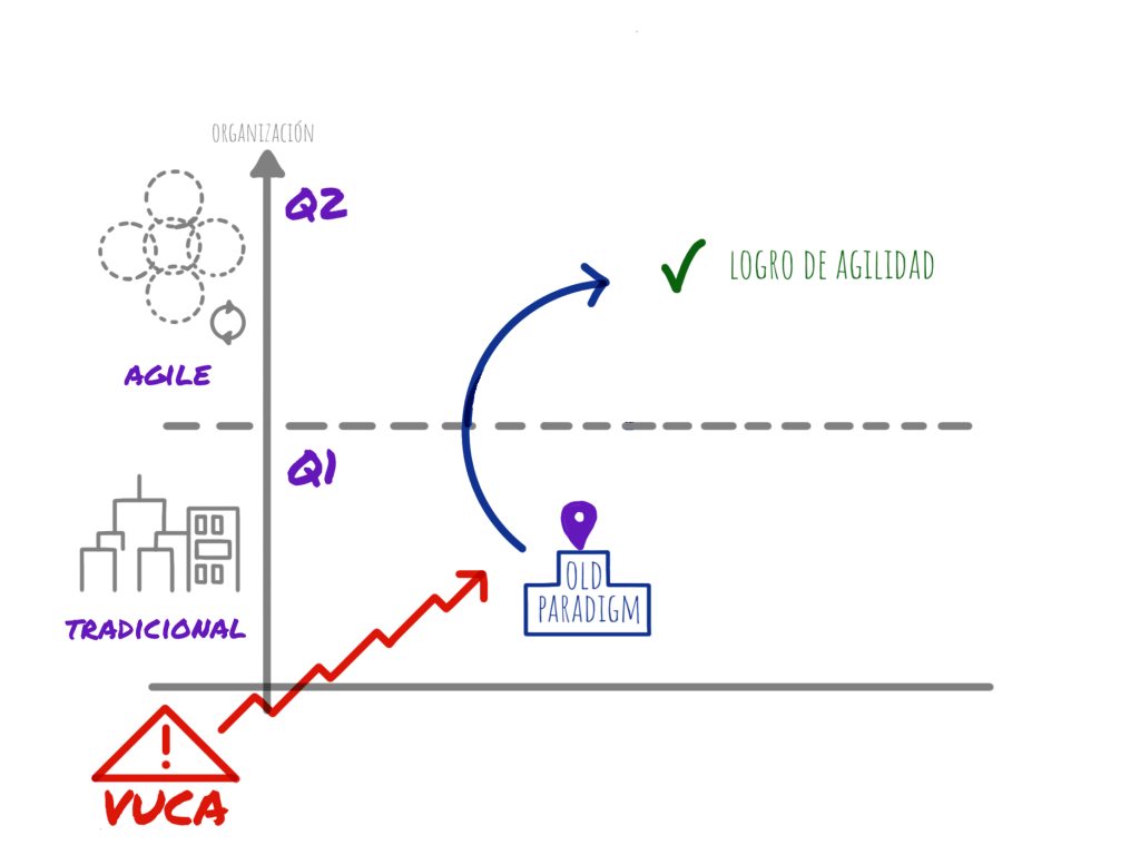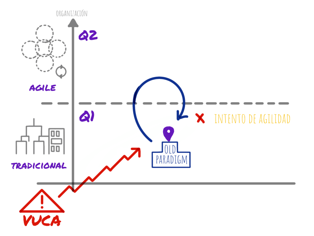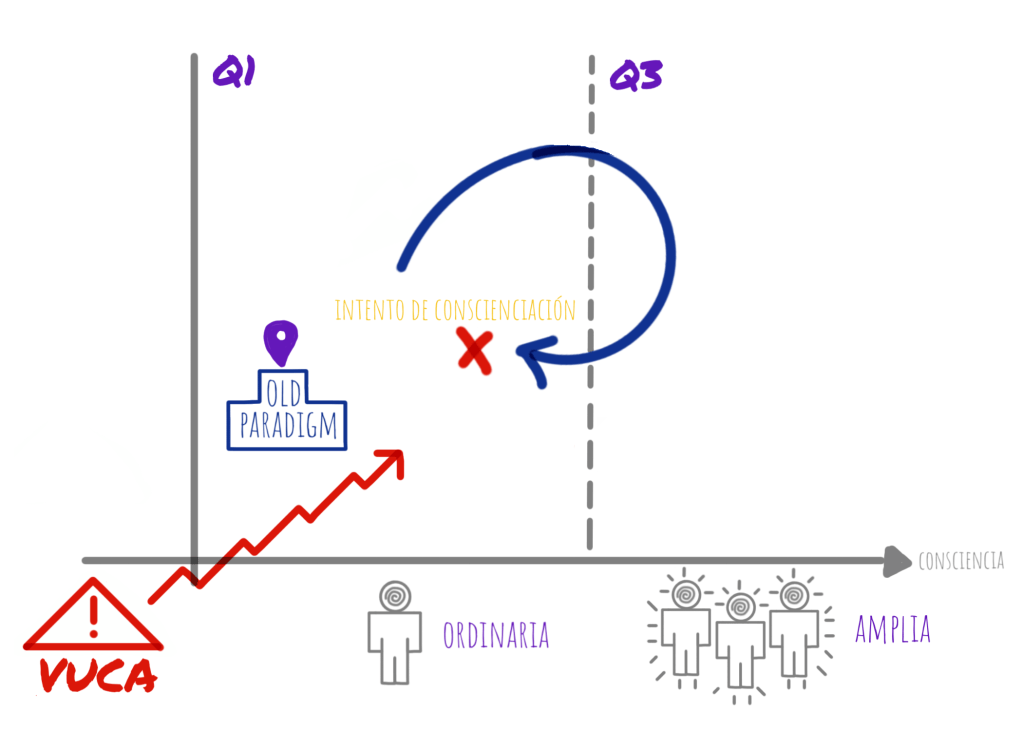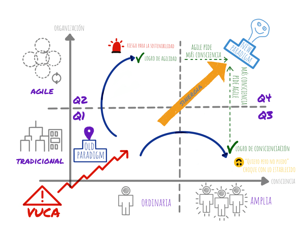 En nuestra opinión, demasiadas empresas concentran su apuesta en un solo eje. Especialmente en el eje organizacional, que al resultar más familiar y tangible sigue brindando cierta sensación de control (¿será casualidad el acrónimo SAFe?). En el post ‘Agile pide más conciencia‘ indagamos qué puede pasar cuando una empresa aborda VUCA sólo por el bando de la organización (Q1 ⇾ Q2); en el post ‘Más conciencia pide agile‘ ofrecemos el análisis complementario (Q1 ⇾ Q3). Aquí, retomamos las conclusiones para lanzar una propuesta…