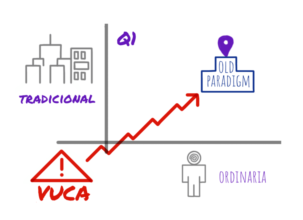 La empresa tradicional (Q1) que consigue ampliar su conciencia (Q1 ⇾ Q3) va evolucionando su identidad interna, pero mantiene sus rasgos externos básicamente invariados. “Ve lejos” (tiene visión), “se da cuenta” (reconoce la necesidad de cambio), pero respecto a su forma de hacer, las cosas quedan bloqueadas, ancladas al pasado. La empresa queda atrapada en sus estructuras, esclava de sus mecanismos. Quizás la incapacidad de reinventarse radica en el desconocimiento de herramientas y modelos de gestión en los que apoyarse.
